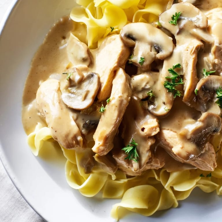 Pin It My stovetop was crowded with pots one rainy Tuesday when I realized I had chicken, mushrooms, and a tub of sour cream that needed using. I wasn't following a plan, just letting the smell of browning butter and garlic guide me. The sauce came together thick and silky, clinging to every strip of chicken, and I remember thinking it tasted like something my grandmother would have made if she'd grown up anywhere near Moscow. That night, with egg noodles tangled under a creamy blanket of stroganoff, I understood why some dishes don't need complexity to feel like home. Sometimes comfort is just butter, mushrooms, and a little paprika doing exactly what they're supposed to do.