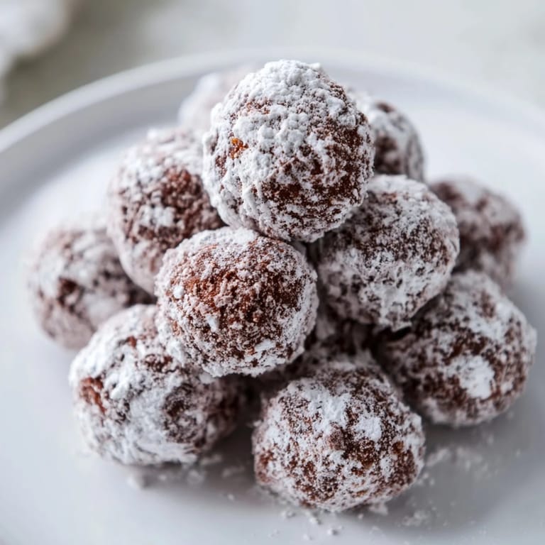 Pin It My neighbor Sarah showed up one afternoon with a plate of these fudgy little spheres, still dusted with powdered sugar like they'd rolled through winter snow. One bite and I was hooked—no oven required, just a few minutes of stirring and your hands getting delightfully messy. She laughed when I asked for the recipe, saying it was something her grandmother made for church potlucks back when convenience was actually convenient. I've made them dozens of times since, and they've become my go-to when I need dessert without the fuss.